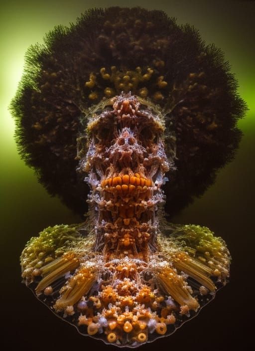 This image shows a bizarre and grotesque portrait of a person. The portrait is reminiscent of an 1870s daguerreotype death portrait, with gothic and fungal elements.