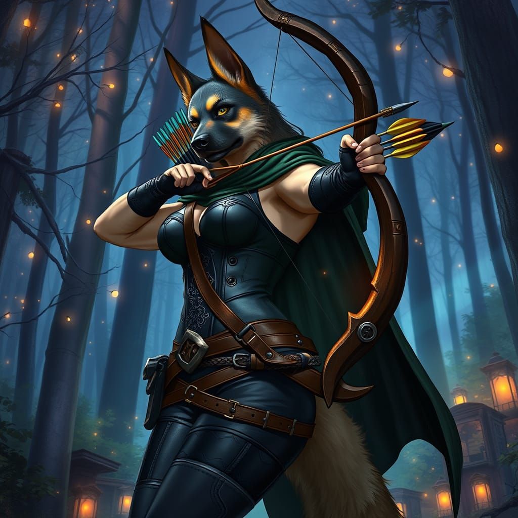 This enchanting image depicts a powerful female German Shepherd archer, adorned in dark leather and a green cloak, standing amidst a vibrant twilight forest with soft, magical lights, blending digital and traditional textures in a captivating anime-inspired style.