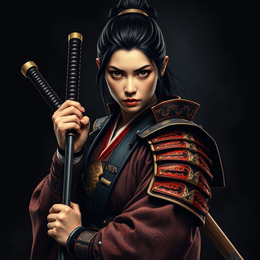A striking picture of a female samurai warrior with a fierce expression, holding a katana. She wears traditional red and gold Japanese armor and stands against a dramatic black backdrop.