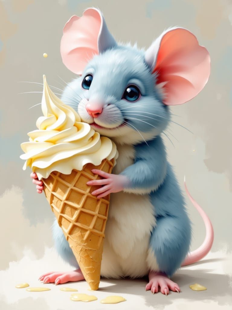<lora:Abstract Painterly:0.8> <lora:Earth and wash:0.8> A photorealistic image of a fluffy light blue-grey mouse with large pink ears and light blue-grey ear outline, gently holding a waffle cone with creamy vanilla soft-serve ice cream, small drops of melting ice cream on the cone. Professional macro ...