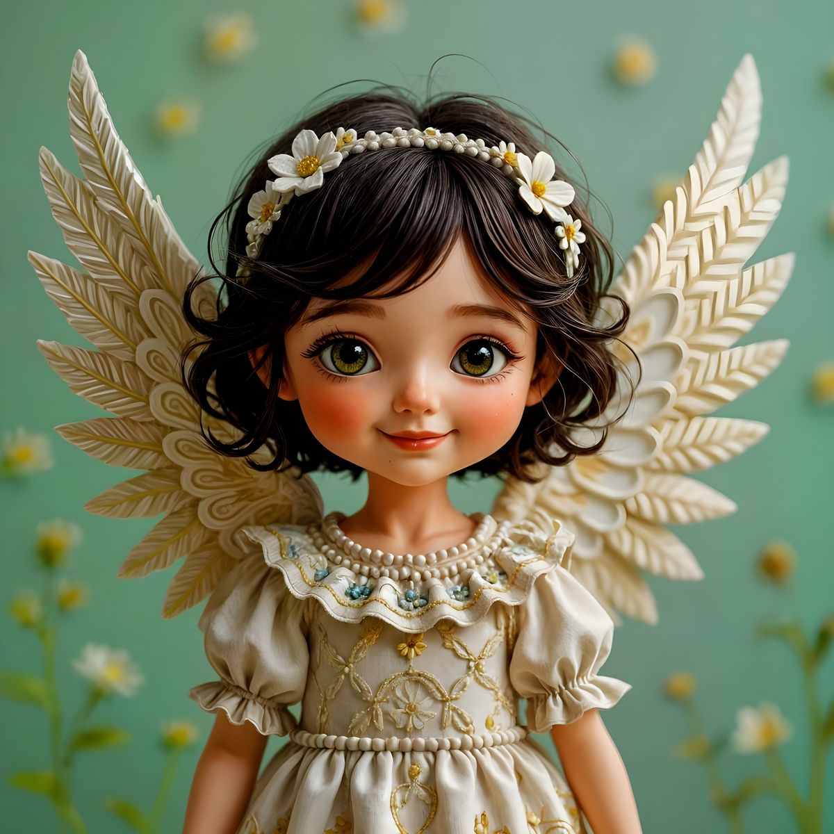 This image shows a whimsical 3D illustration of a small angel with a dirty face and a mischievous smile. The artwork is finely detailed, textured, and surreal.