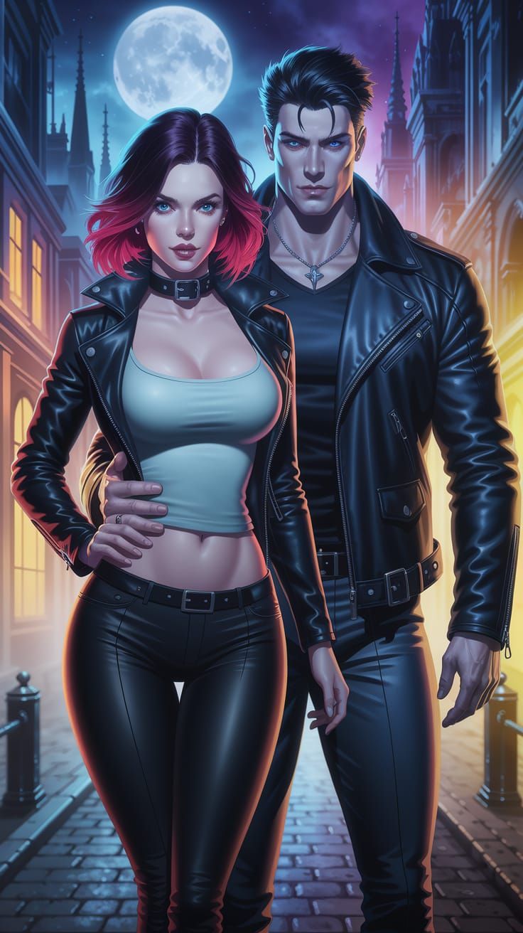 A striking image of a curvy woman with red hair beside a handsome man in a gothic city. Rendered in a vivid, cyberpunk digital art style with dynamic lighting.
