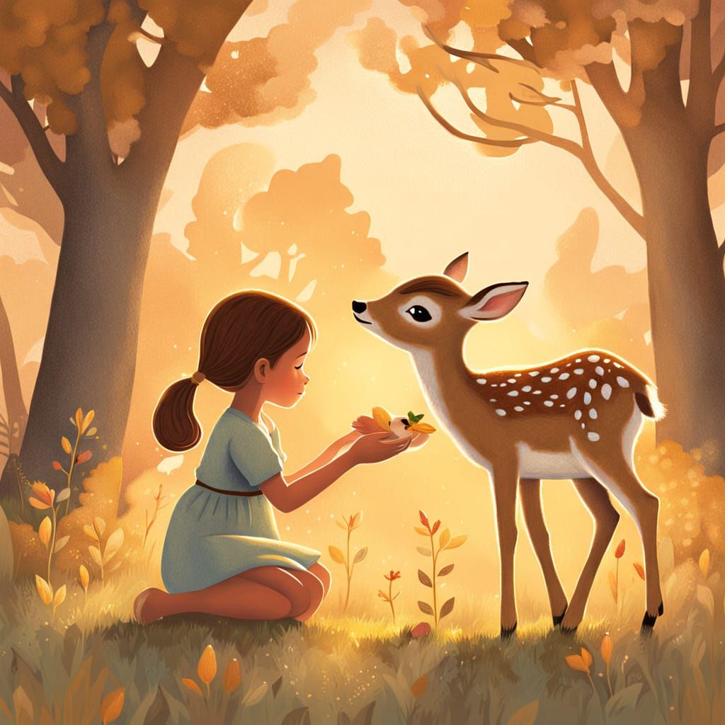 This charming children's book illustration features a fawn gently eating from a little girl's hand, bathed in soft golden hour light. The art evokes a heartwarming, innocent, and naive folklore atmosphere with textured brushstrokes.