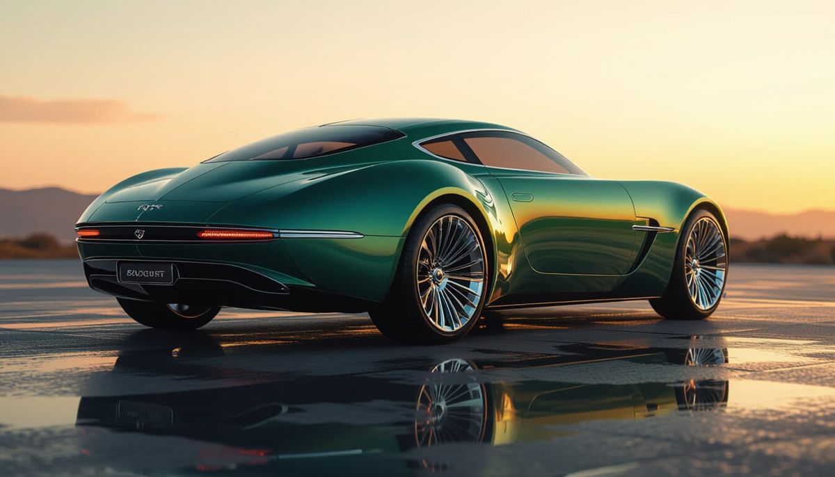 This image shows a Bradley GT car with a metallic green finish, chrome details, and a glossy texture. The car is set against a sunset background with diffused lighting, as photorealistic digital art.