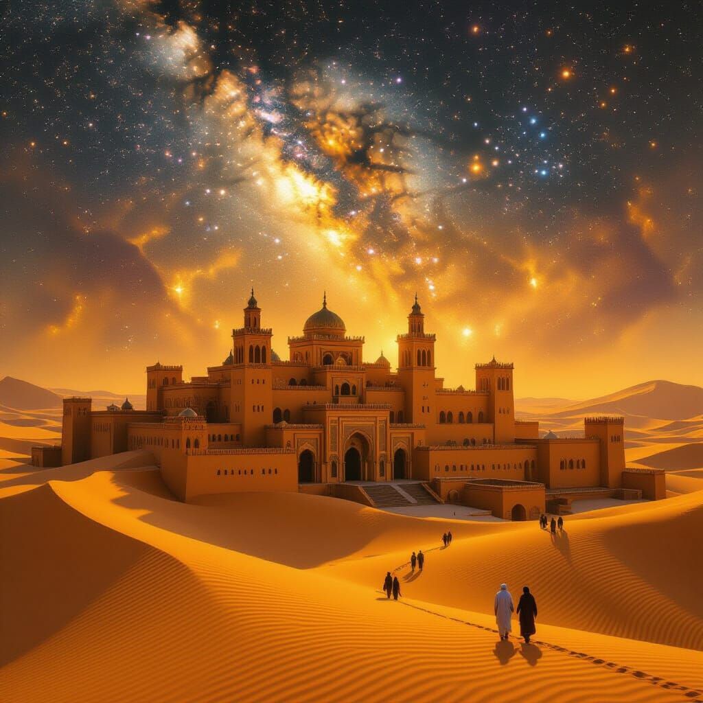 This image depicts a grand Moroccan town at dusk, illuminated by golden light and cosmic starlight. Cinematic style highlights intricate architecture and sandy landscapes under a starry sky.