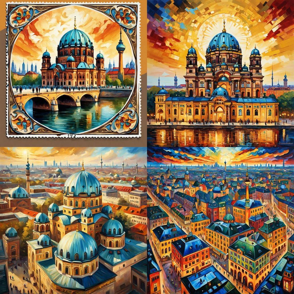 This image shows a vintage-style postage stamp design depicting Berlin in 1902. The scene uses a vibrant color palette and a centrally focused composition.