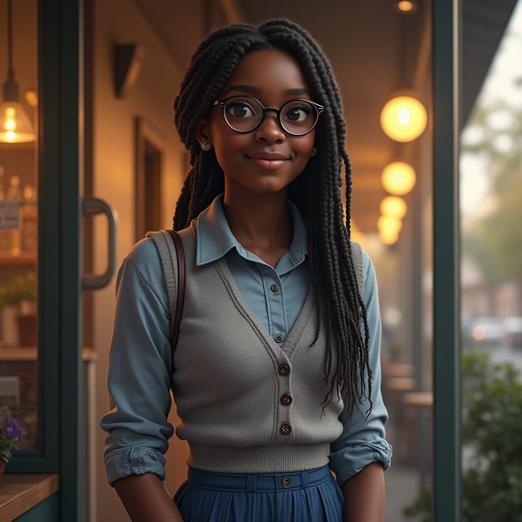 A realistic image of a beautiful African American teen named Deborah Douglas with braided hair. She wears a sweater, shirt, skirt and glasses, walking from a coffee shop in warm light, in photorealistic digital art.
