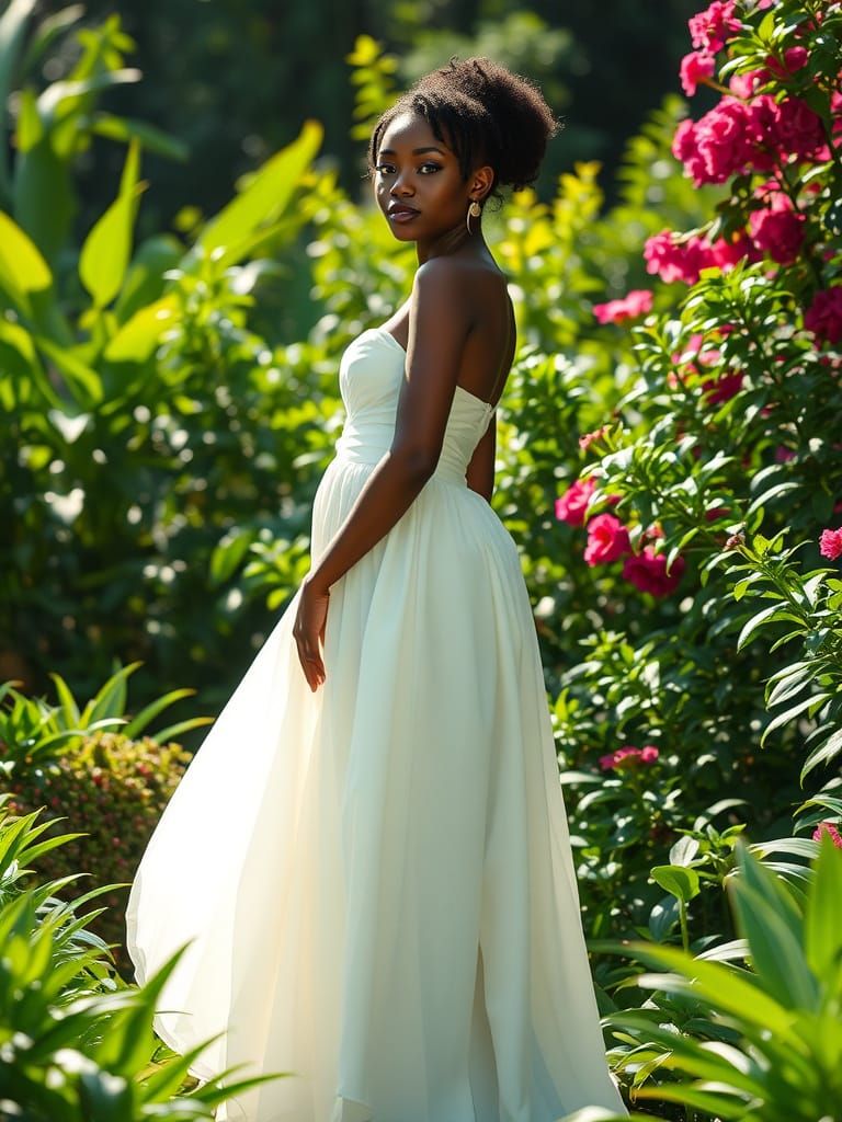 This image shows a young Black woman in a flowing white gown, standing in a sunlit garden. The photorealistic style captures lush greenery and gentle light.