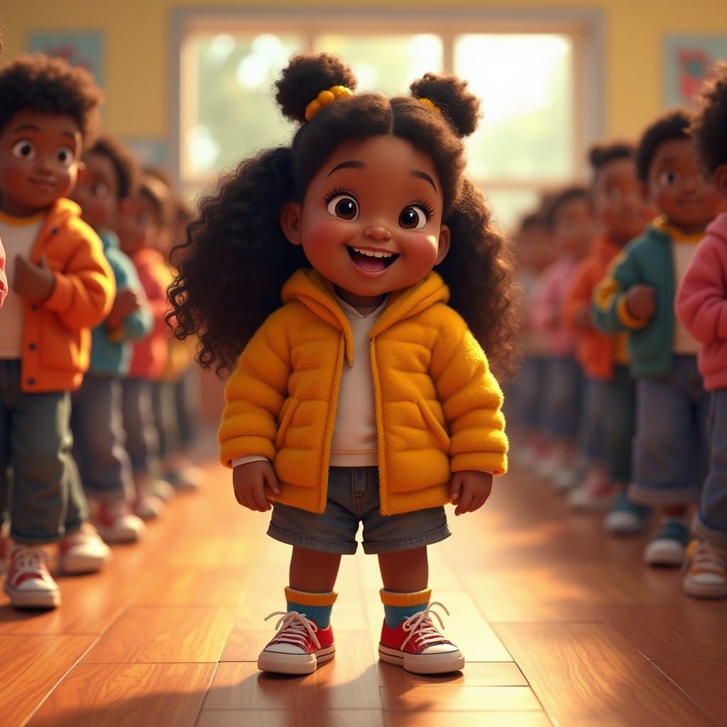 This image shows a joyful Black teenage girl with golden-brown skin at a school assembly. The vibrant, textured scene commemorating Malcolm X's birthday is rendered in a Pixar-inspired 3D style.