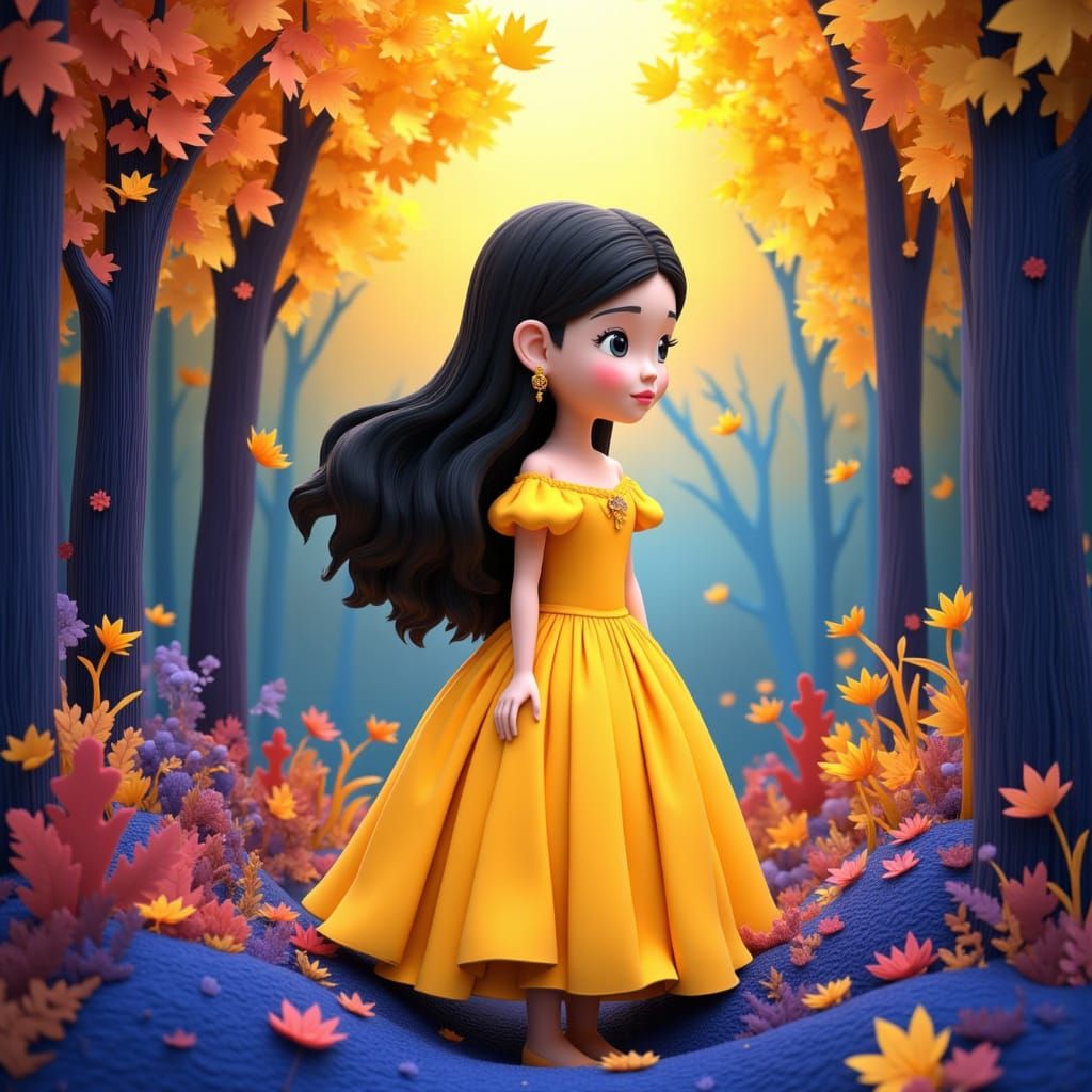 This image shows a beautiful princess with black hair and a yellow dress standing in a vibrant forest with volumetric lighting. The image is rendered in a whimsical, storybook aesthetic.