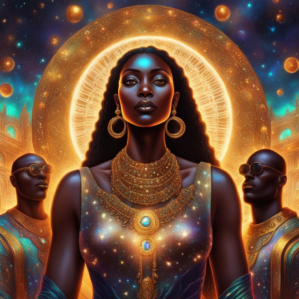 This image shows a beautiful dark-skinned woman with glowing gold eyes, richly dressed, and surrounded by bowing men in a jewel-filled environment. The image is a holographic astral cosmic illustration.