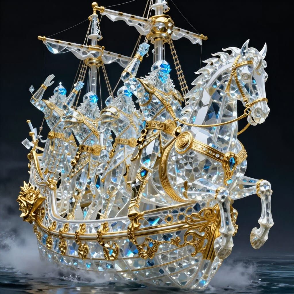 This image depicts a fantastical pirate ship made from crystal bones and gold. It features a spectral horse figurehead and a crew of diamond pirates with luminous details, presented in an epic fantasy concept art style.