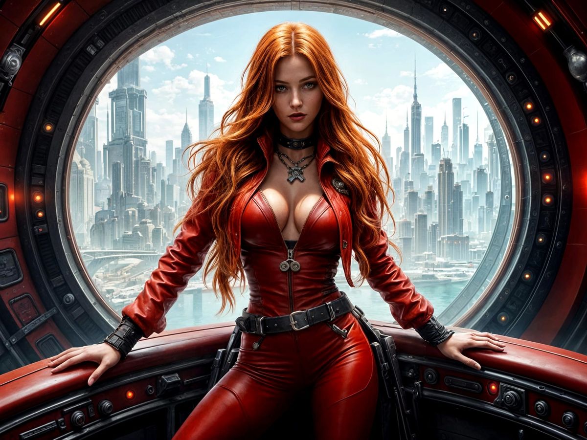 A digital painting of a confident space pirate with auburn hair, wearing a red leather outfit on her ship's bridge. A futuristic cityscape is visible in the rococo wave style.