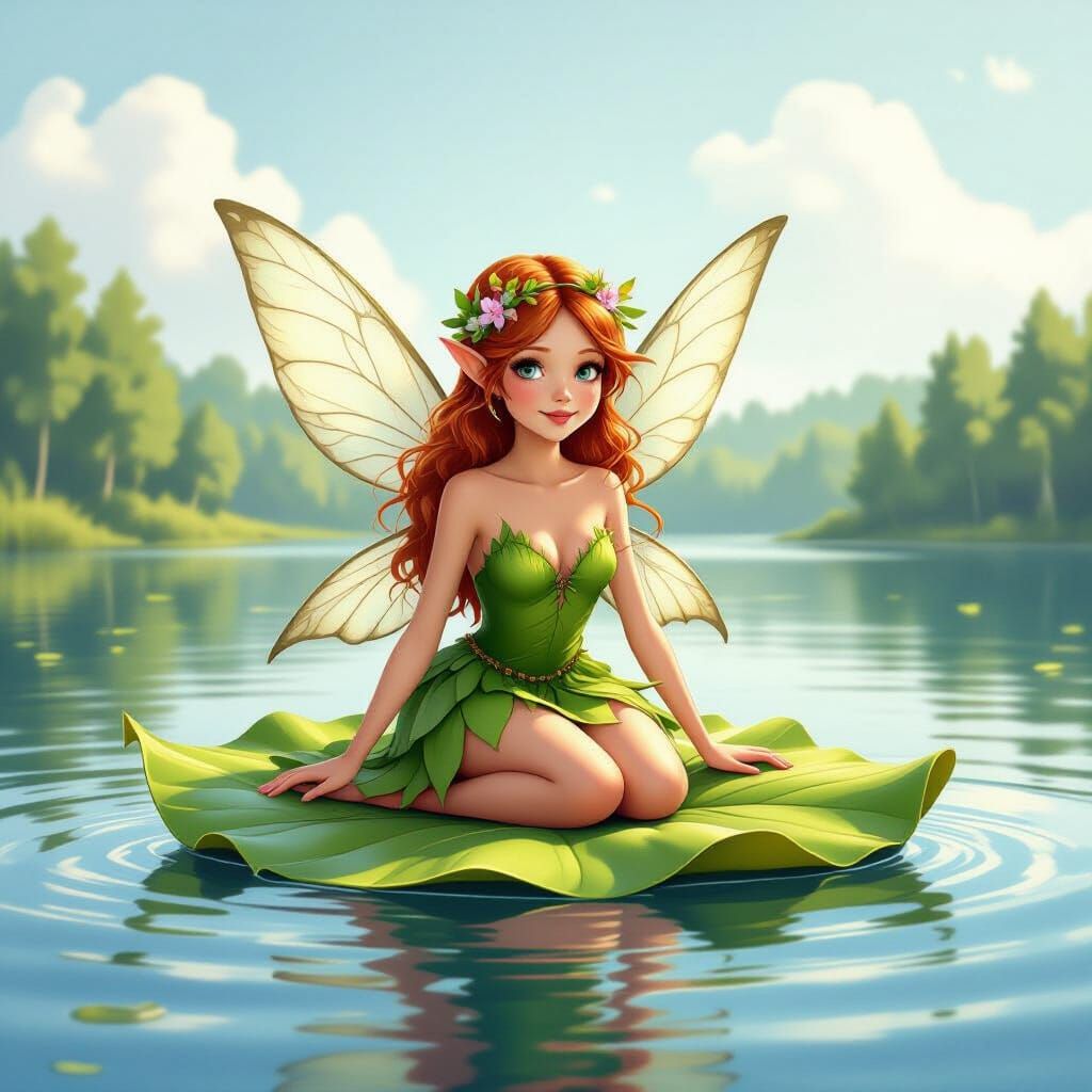This image shows a whimsical fairy floating on a leaf across a serene lake. The fairy wears a charming leaf dress, blending harmoniously with her surroundings.
