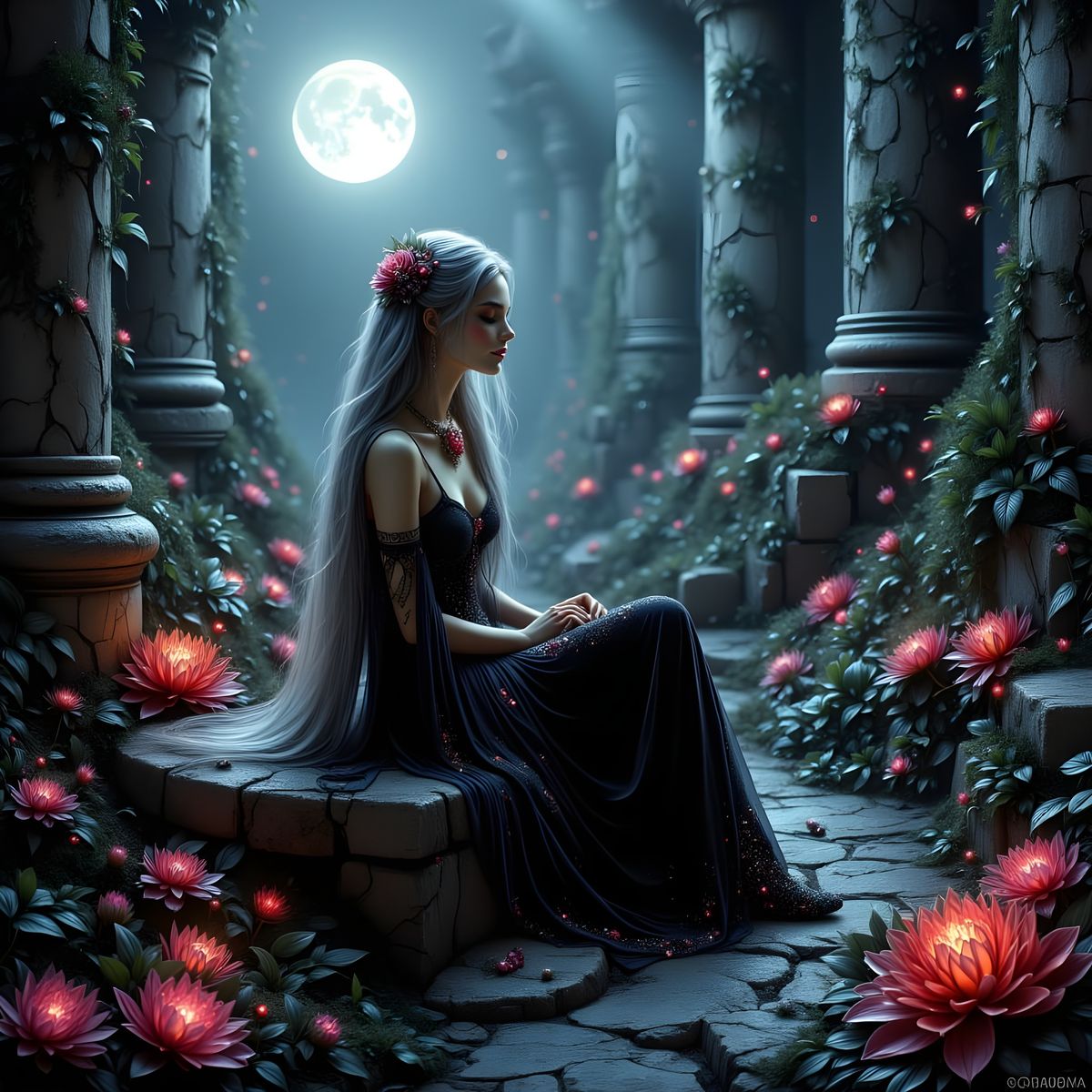 This image shows a serene Norse goddess seated on a stone pedestal amidst the mystique of moonlit temple ruins, with long silver hair, a warm smile, and a dark dress, rendered in a bold and colorful style reminiscent of Michael Garmash and Leonid Afremov