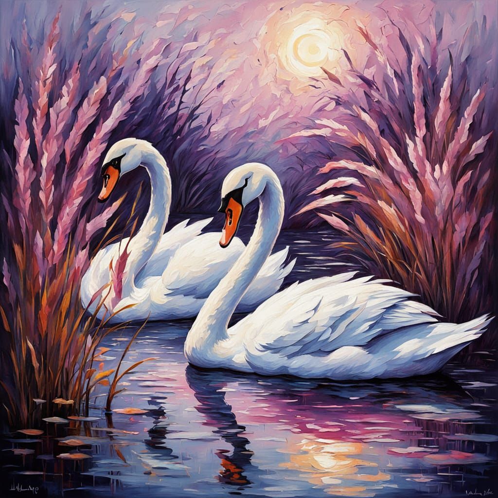 A striking picture of two swans swimming in a reedy lake. The surrealistic oil painting features a peeling plaster texture, warm greys, and faded gold lighting in a neo-impressionistic style.