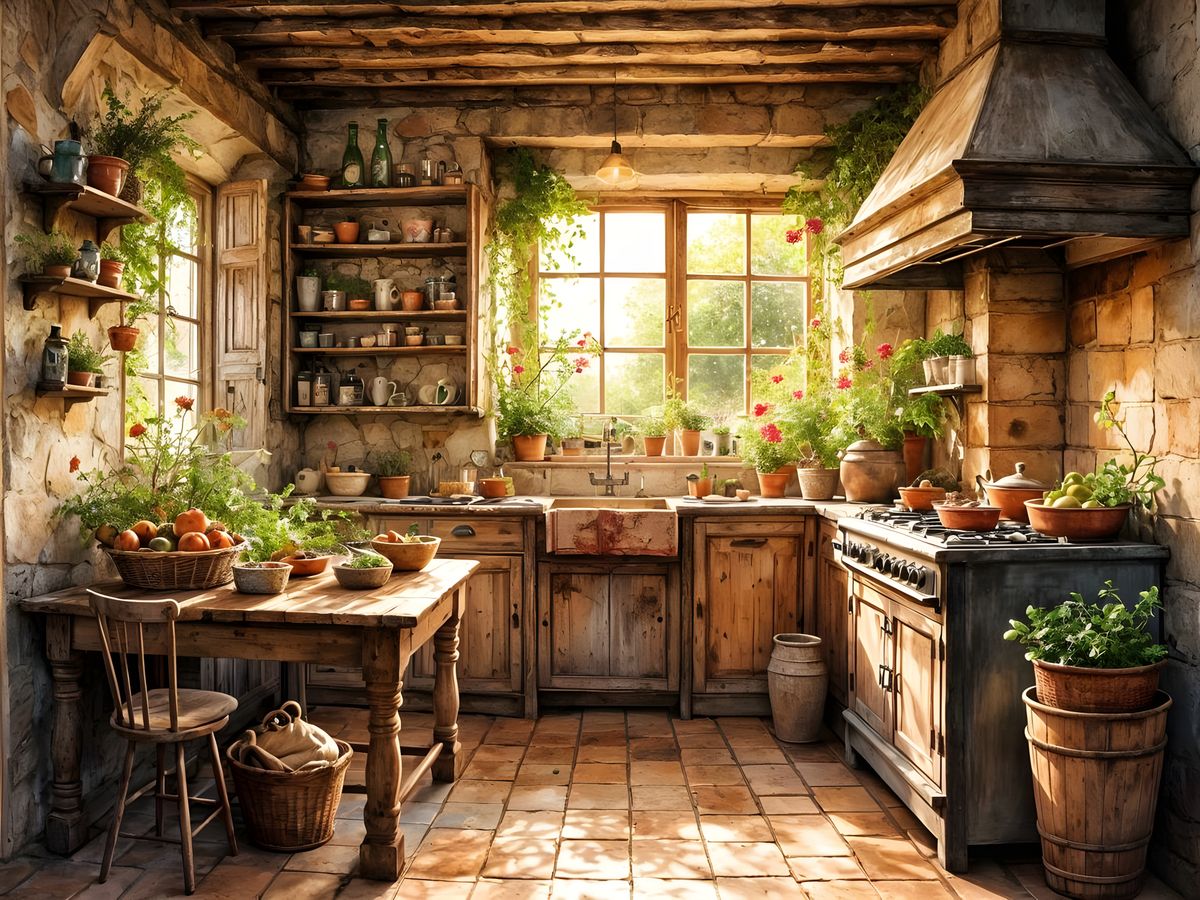 This image displays a beautiful Italian country kitchen rendered in an ink wash art style. The scene evokes a rustic and inviting atmosphere.