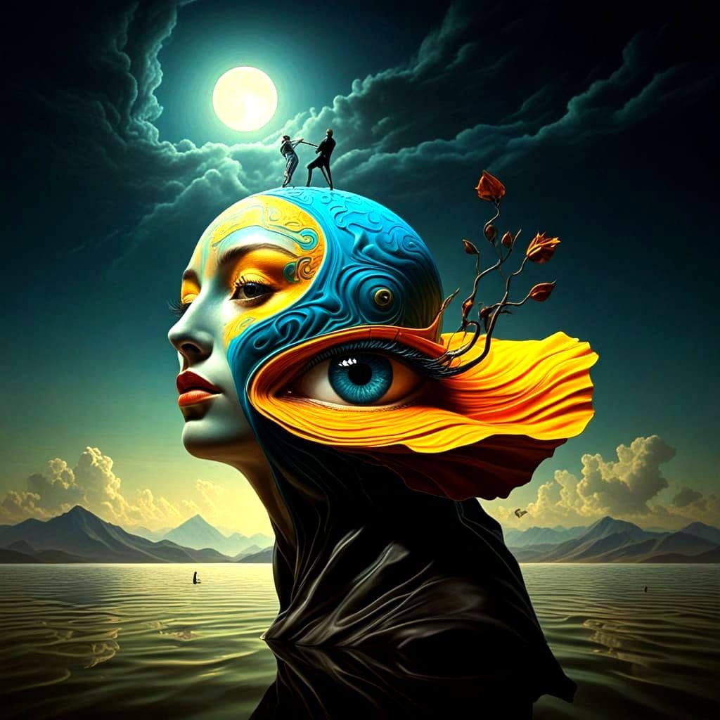 stunning fantastic surrealistic painting in the style inspired by Salvador Dali, crisp, smooth, polished, ultra quality, high contrast, colorful, rich vivid colors, vibrant luminous colors, intense saturated colors, bright bold colors, joyful upbeat mood, fantasy, surrealism, hyperrealism, minimalism, ...