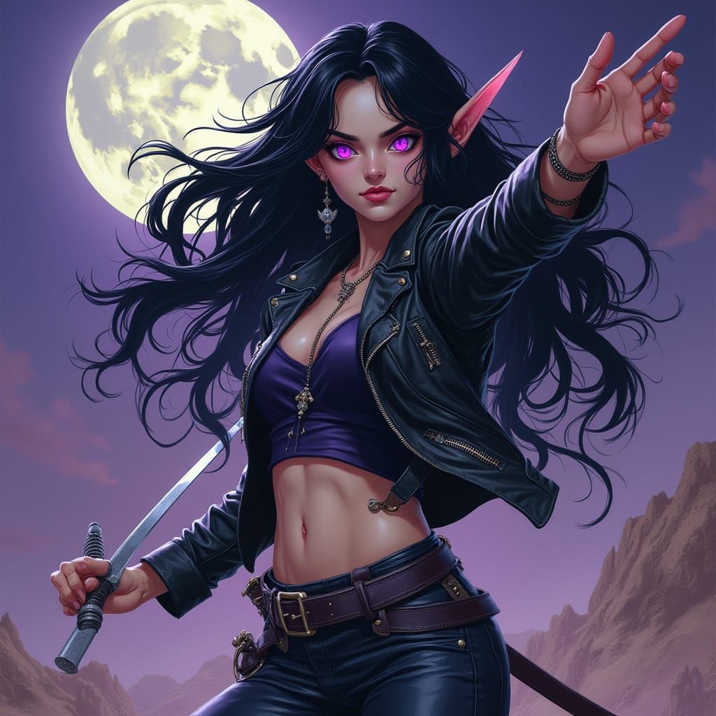 A striking picture of a moon elf assassin ready to attack. She has long black hair with a white streak, and wears a dark leather outfit in a dark fantasy style with vibrant colors and dynamic movement.