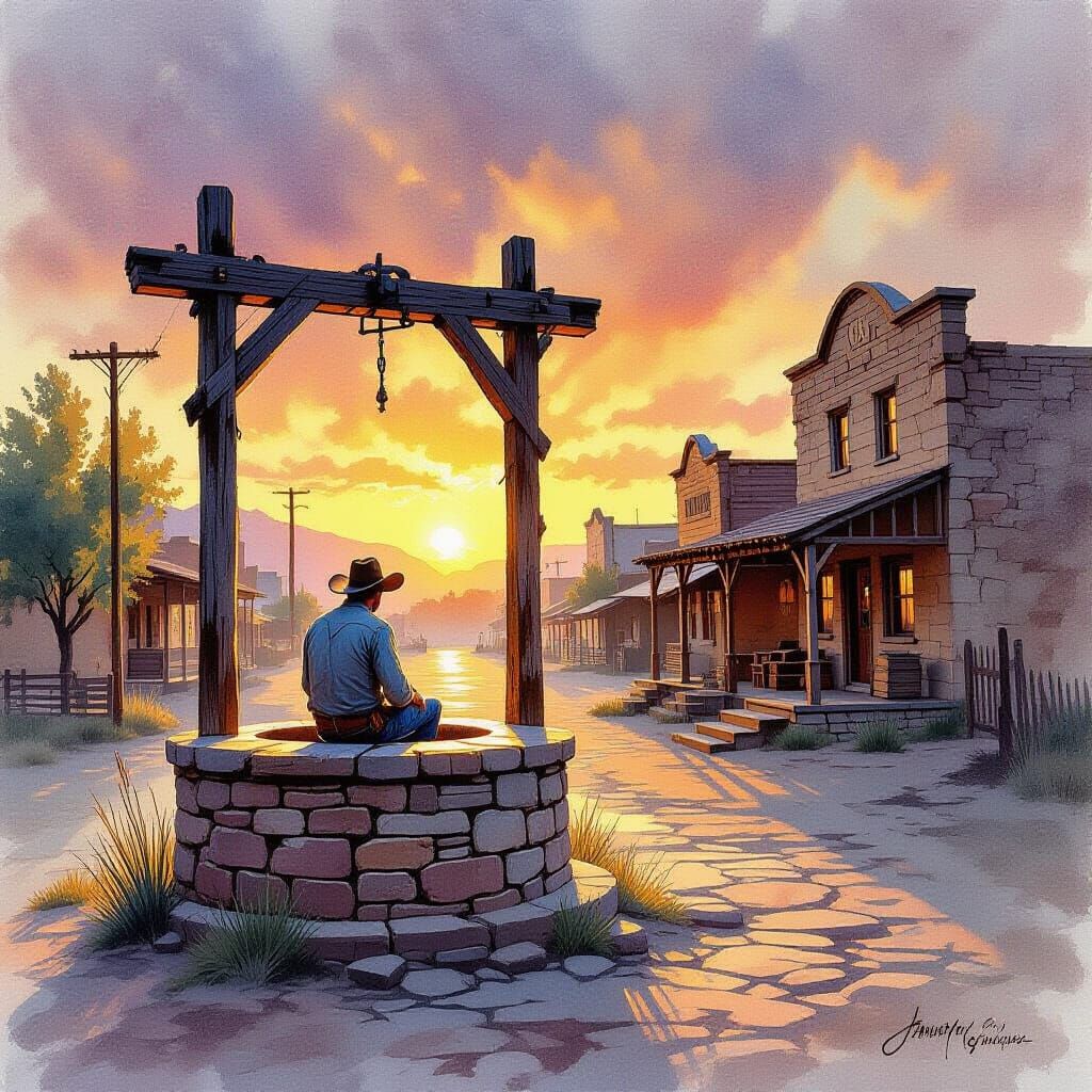 A watercolor painting of a cowboy in a rustic western town at sunset. The image shows a stone well and thatched roofs, rendered with rough paint strokes and textures in a fairytale style.
