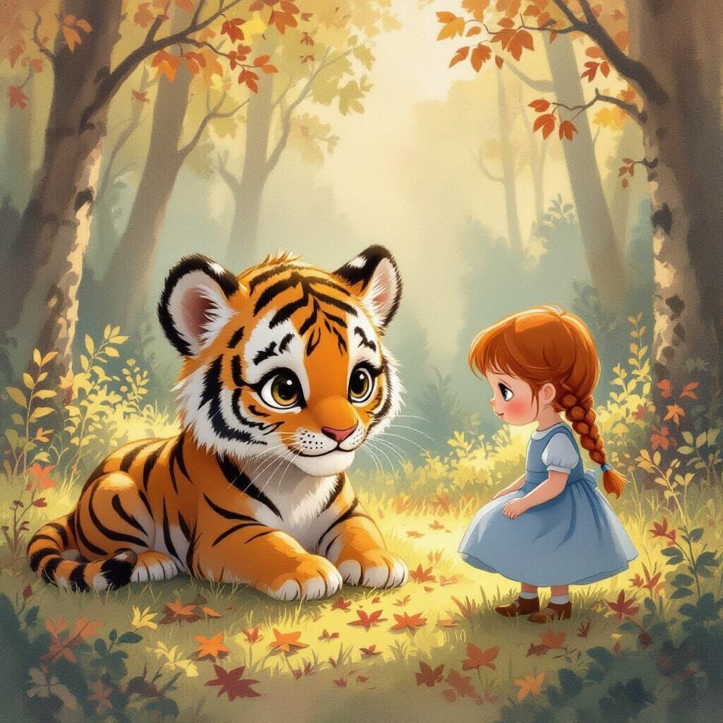 A heartwarming illustration of a sad tiger cub discovered by a red-haired girl in a sunlit forest. The scene captures a moment of gentle discovery and friendship in a storybook style.