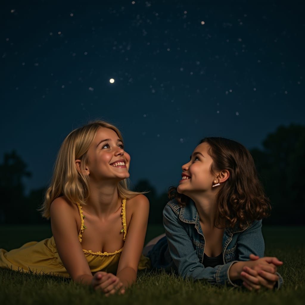 This image shows two girls laying in a field, looking at the stars. The style evokes intimate and naturalistic photography, reminiscent of golden age portraiture.