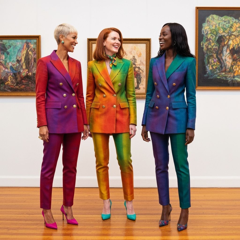 This vibrant image shows three professional women laughing in a contemporary art gallery. They wear matching, colorful double-breasted blazercoats and pants, accented with silk scarves and heels.