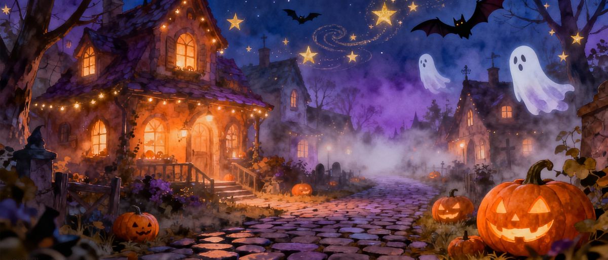 A charming Halloween fantasy scene with glowing haunted houses, smiling pumpkins, and floating ghosts on cobblestone paths under a starry sky. Rendered in a cinematic style with rich detail.