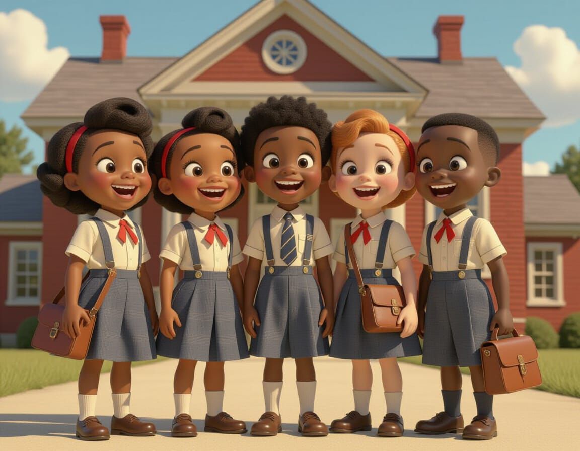 This image shows five African American children with expressive eyes standing in front of an old 1940s school. The 3D cartoon style evokes Pixar and DreamWorks, with dollcore aesthetics and retro school uniforms.