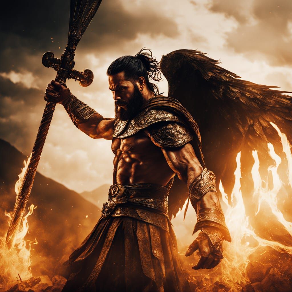A striking picture of a muscular warrior battling a pit fiend. The image, in a dark fantasy art style, features dramatic lighting, a warm color scheme and film grain to enhance the cinematic feel.