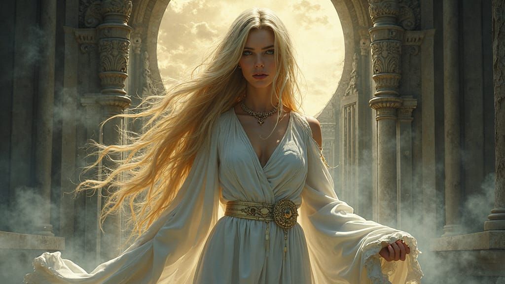 This image is a stunning representation of a goth bride, dressed in white robes reminiscent of Satan, with intricate details and a dark, atmospheric aesthetic, inspired by the works of Alphonse Mucha and Luis Royo.