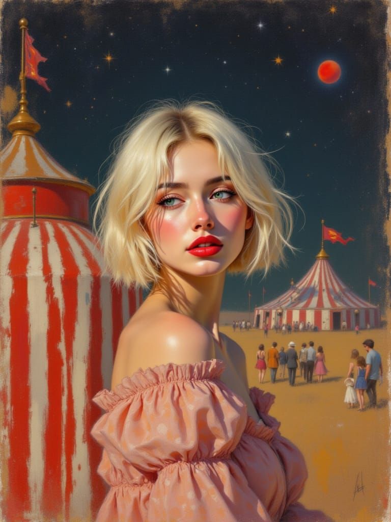 This image shows a woman with freckles and red lips standing against a vibrant red and white striped background. A cosmic night sky with a red planet adds a surreal, dreamlike atmosphere. Rendered in a soft pastel, golden hour aesthetic.