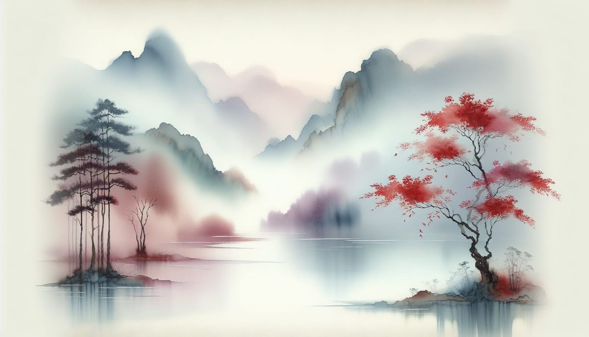 This image depicts a peaceful watercolor painting of misty mountains, a tranquil lake, and two trees with vibrant red leaves, set in a serene East Asian-inspired landscape with soft, minimalist brushstrokes and subtle gradients.