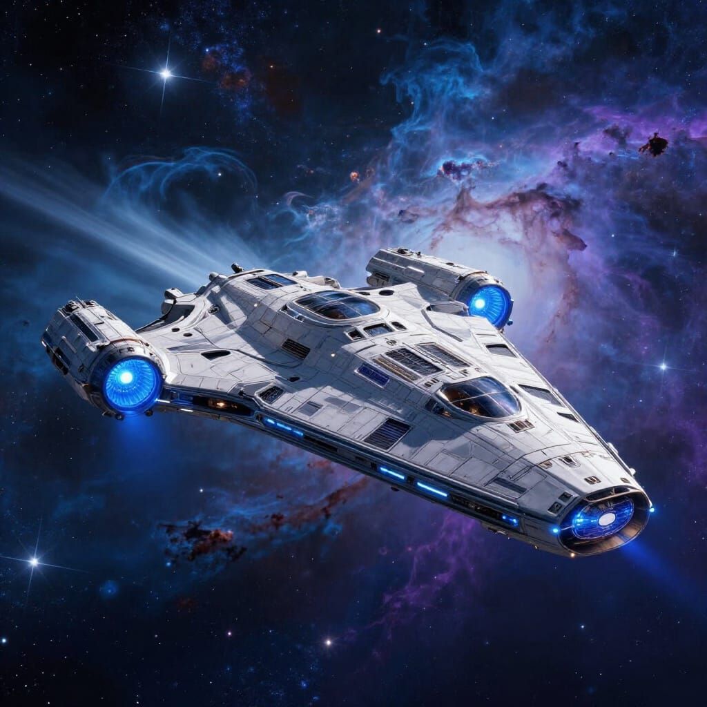 This image shows a sleek, futuristic spaceship with glowing blue vents and metallic plating, traveling through a colorful nebula. Rendered photorealistically with cinematic lighting, it emphasizes deep blues and purples.