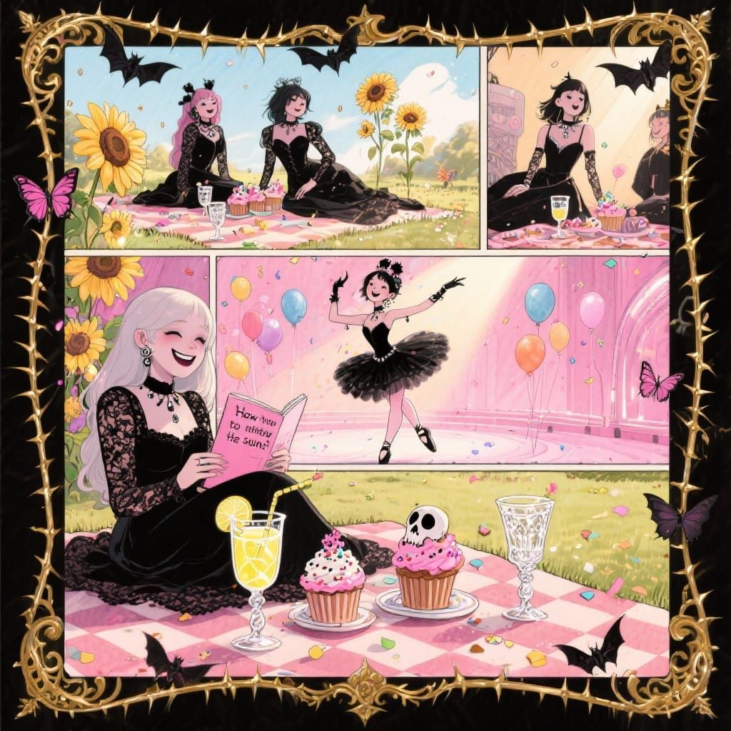 This 8K comic panel illustration shows goths finding joy and humor in light, from Victorian picnics to pastel stages, with ornate gothic borders and evolving cinematic colors.