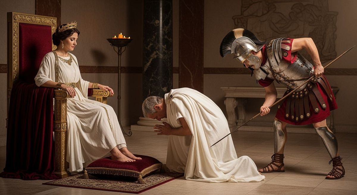 This image shows Empress Messalina on a golden throne, a senator kneeling before her, and a legionnaire forcing the senator's bow. The scene is reminiscent of historical paintings with dramatic lighting and sharp focus.
