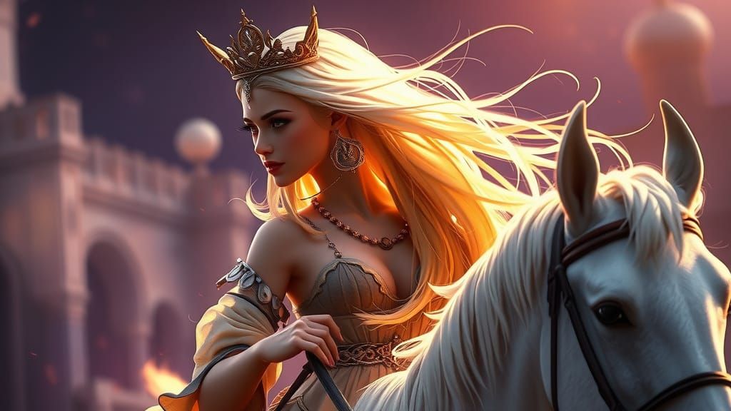 A striking picture of a beautiful young medieval queen with long blonde hair and a crown, riding a white horse. This dark fantasy concept art features dynamic lighting and intricate details.