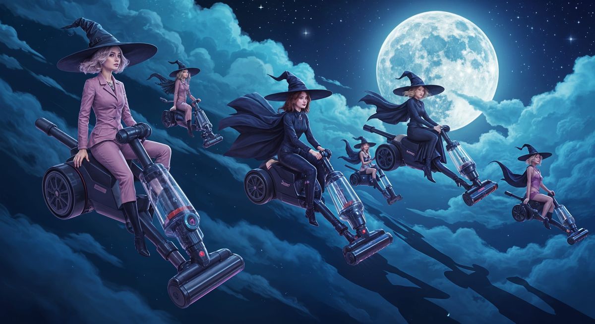 This image features stylish modern witches soaring through a luminous night sky, riding on vacuum cleaners. The scene is illuminated by a radiant full moon.