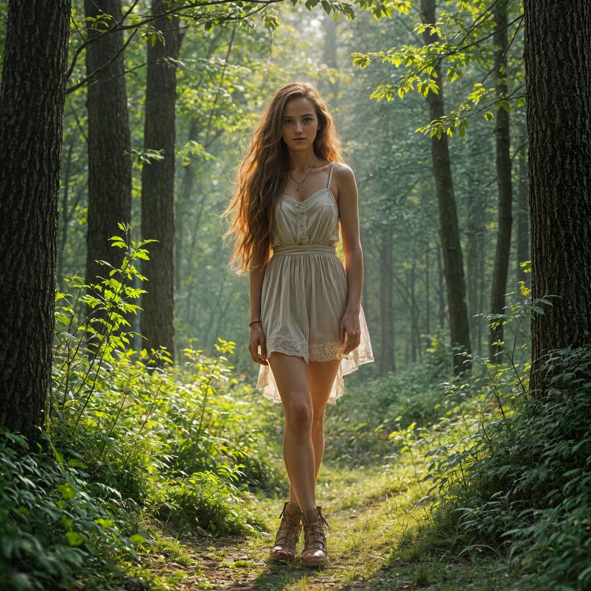 This image shows a slender auburn-haired woman in a sun-dappled forest clearing. Partially see-through underwear hints at her form in this hyperrealistic and ethereal depiction with classical romantic influences.