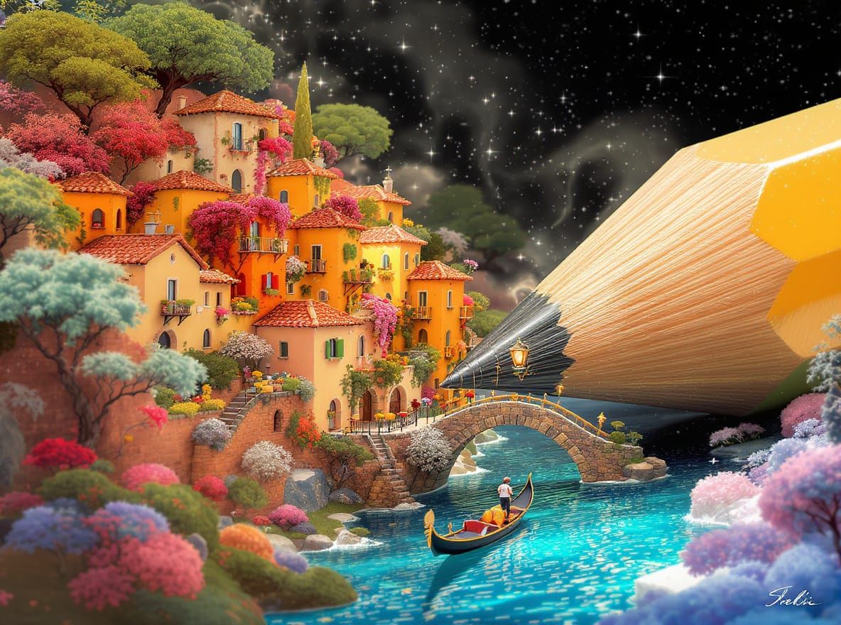 This image shows a whimsical miniature Italian village inside a giant pencil. A tiny gondola navigates a river amid colorful pointillist details reminiscent of fantasy art.