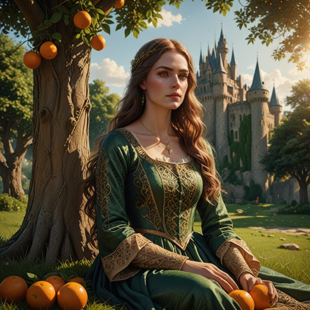 A serene medieval fantasy portrait of a beautiful woman, surrounded by lush garden surroundings and a castle in the background, with soft sunlight filtering through the leaves and warm tones illuminating her gentle features and intricate textures.