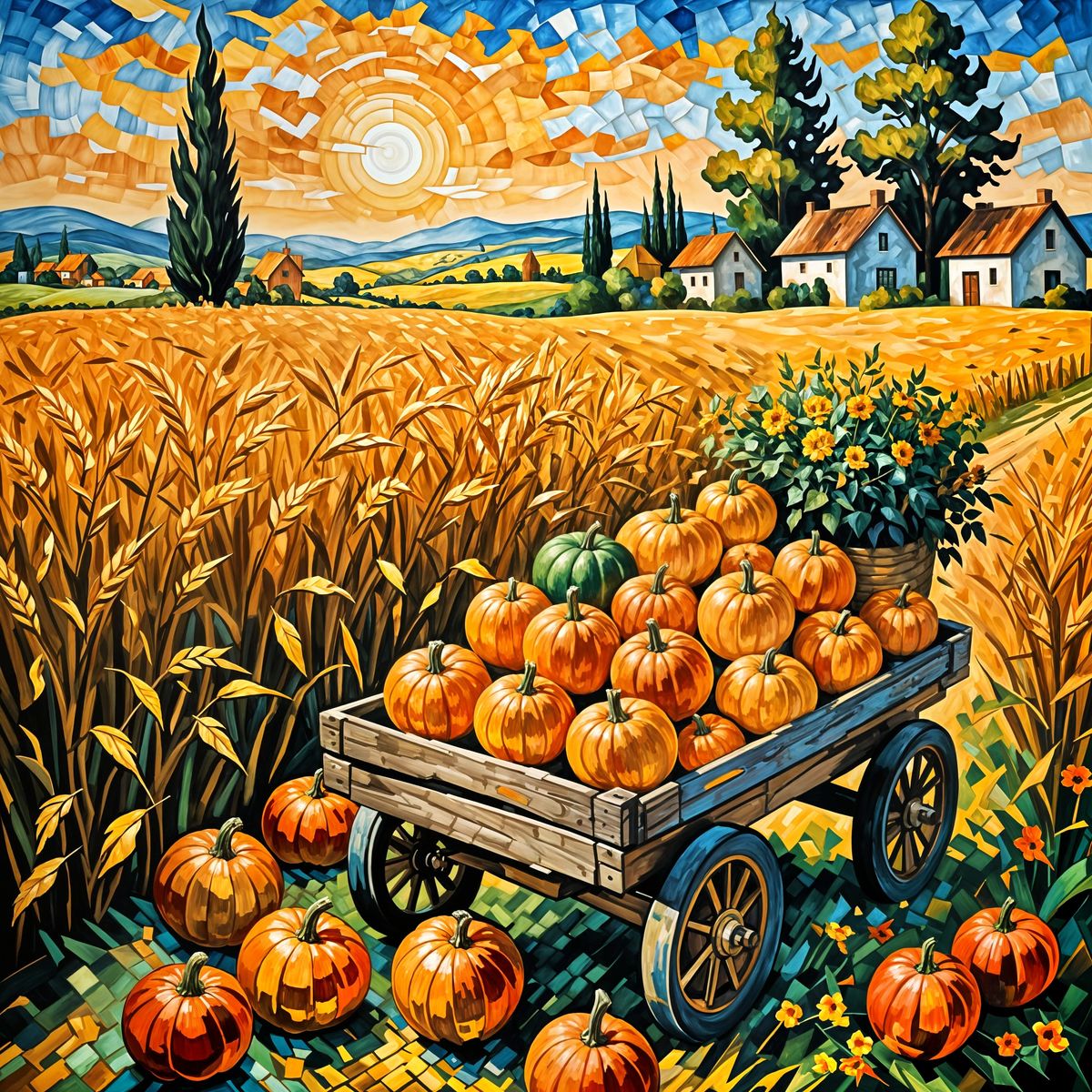 A vibrant scene of an autumn harvest with golden wheat fields under a warm, setting sun. Pumpkins and ripe apples are piled high in a rustic wooden cart. The scene is bathed in the soft, ethereal glow of golden hour, casting long shadows and highlighting the rich, earthy tones of the landscape. Rendered ...