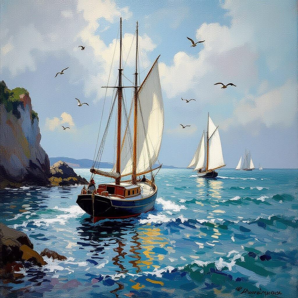 A realistic oil painting of a calm sea with gentle waves, featuring a distant sailboat, low-flying seagulls, and rugged rocks. The artwork captures an impressionistic style, reminiscent of classic seascape paintings.
