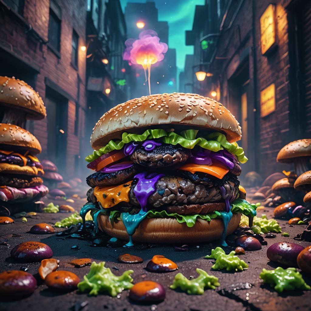 A detailed matte painting of a corrupted hamburger in a dark alley. The low-angle shot features moldy buns, rotten patty, glowing purple mushrooms, and neon green slime with steam. Rendered in Unreal Engine 5.