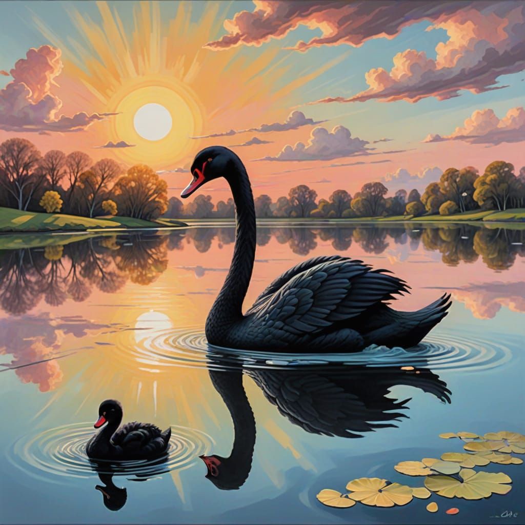 A striking picture of a black swan on a lake under a bright sun. Clouds fill the background in this Dadaism-style anti-art piece with soft, natural light and pastel colors, resembling airbrushed graphic cutouts.
