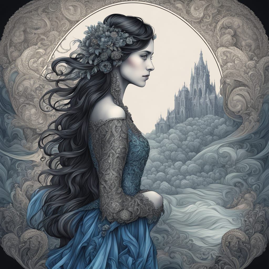 This image shows a solitary woman on a craggy cliff, gazing over a misty, dreamlike vista. The charcoal drawing style emphasizes intricate details and dynamic lighting, with a dark romantic aesthetic.