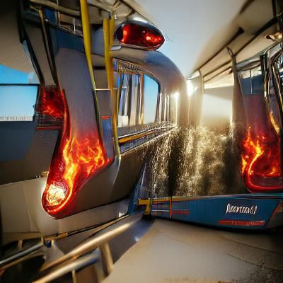 This image depicts a monorail cutting through a hellish landscape. The scene features hyperrealistic details, volumetric lighting, and a high-resolution rendering, creating a vivid and dramatic experience.
