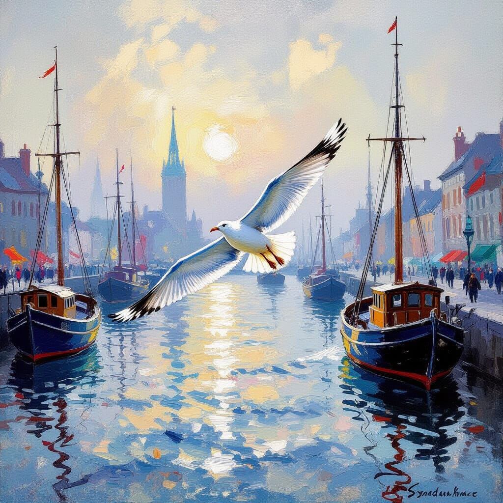 A stunning image of a seagull soaring over a busy harbor. The scene is bathed in soft morning light, rendered with expressive brushstrokes and rich colors in an impressionistic style.