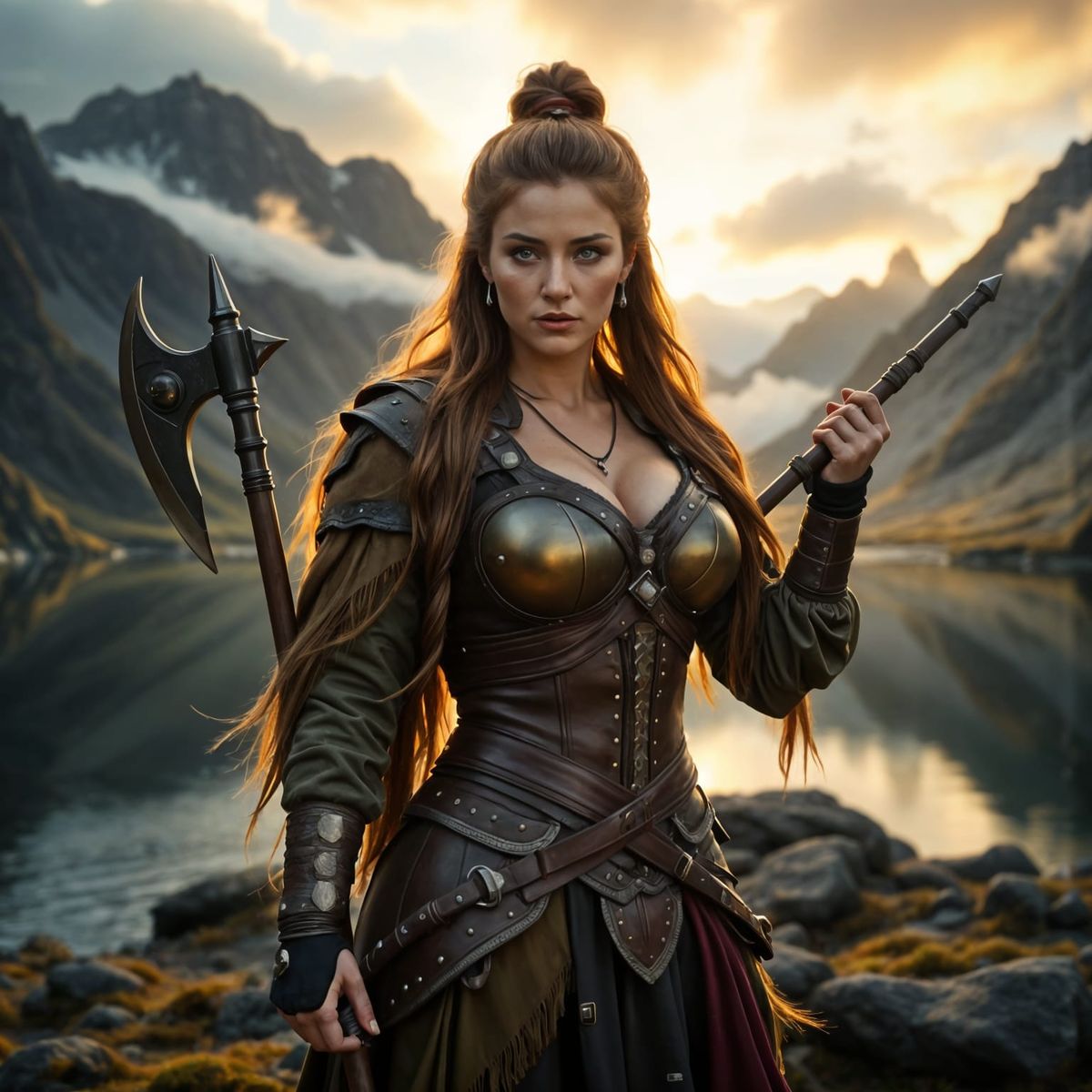 A stunning, atmospheric image of a plus-size Viking warrior woman, captured in cinematic hyper realism with vibrant colors and dramatic lighting