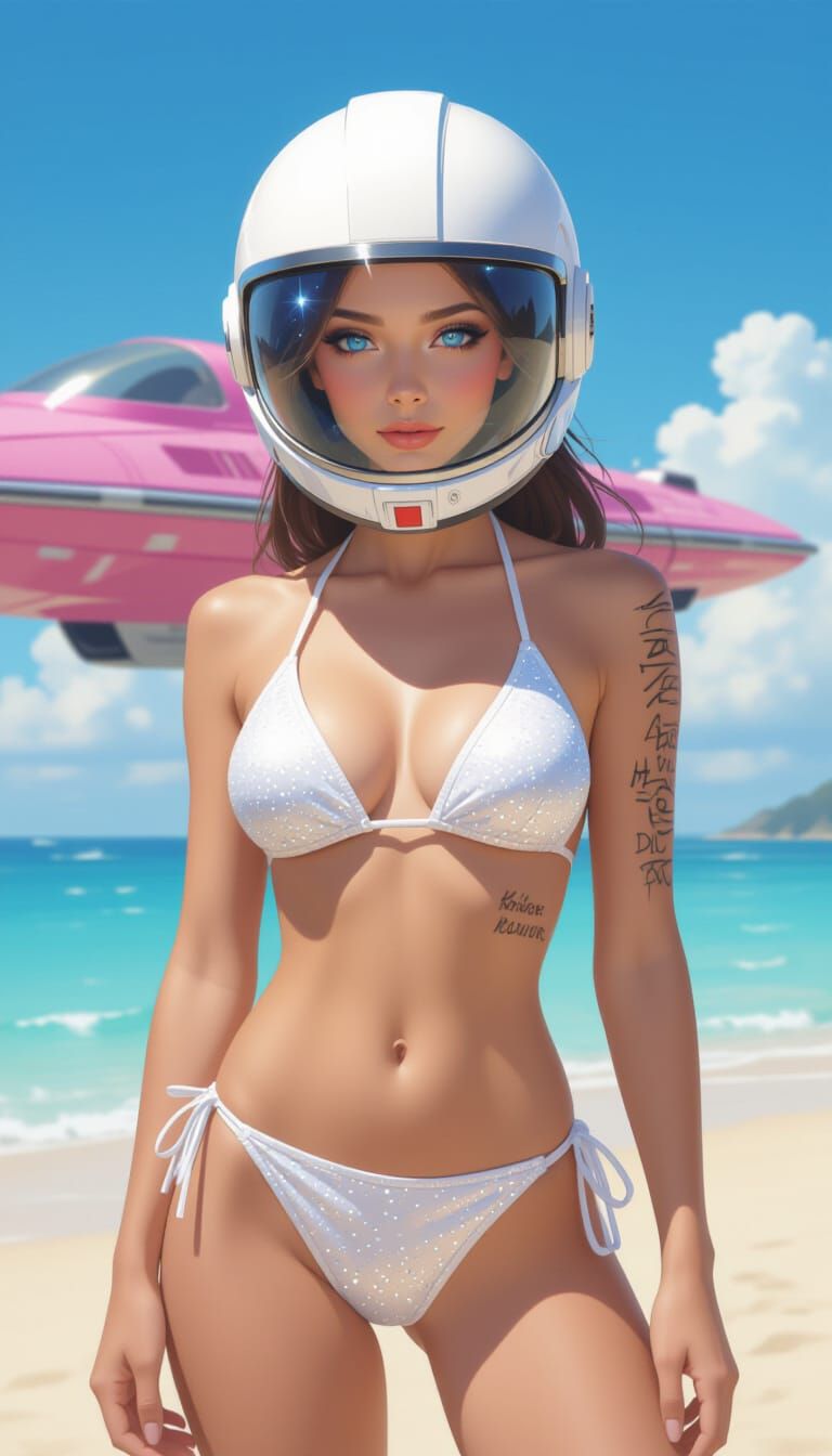 A hyper-realistic image shows a beautiful woman in Star Wars cosplay. She wears a sequined bikini, a clear helmet, and has blue glittery eyes. Tattoos adorn her athletic physique, set against a beach and space cruiser backdrop.